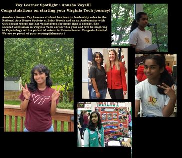 Yay Learner Spotlight - former student Anusha Vayalil has secured admission in Virginia Tech and will be majoring in Psychology. She has held leadership roles including the National Art Honor Society at Briar Woods.